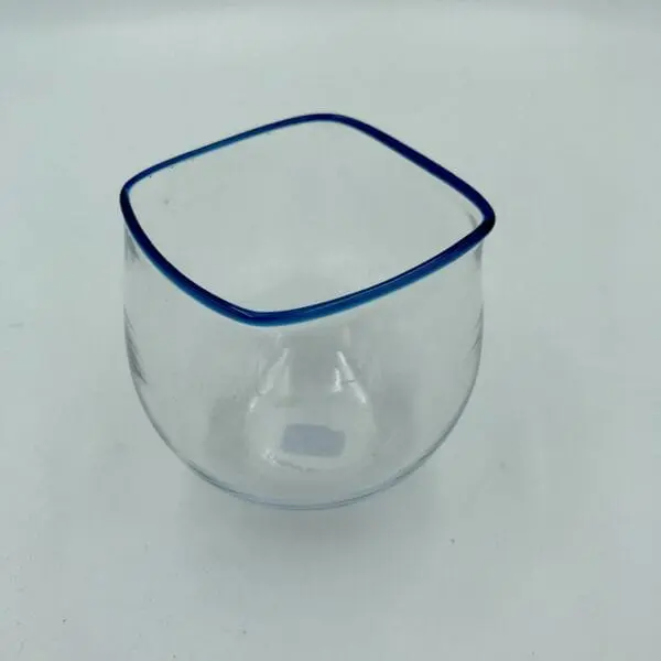 Peter Svarrer er glaspuster, lysets mester. Drikkeglas med blå kant